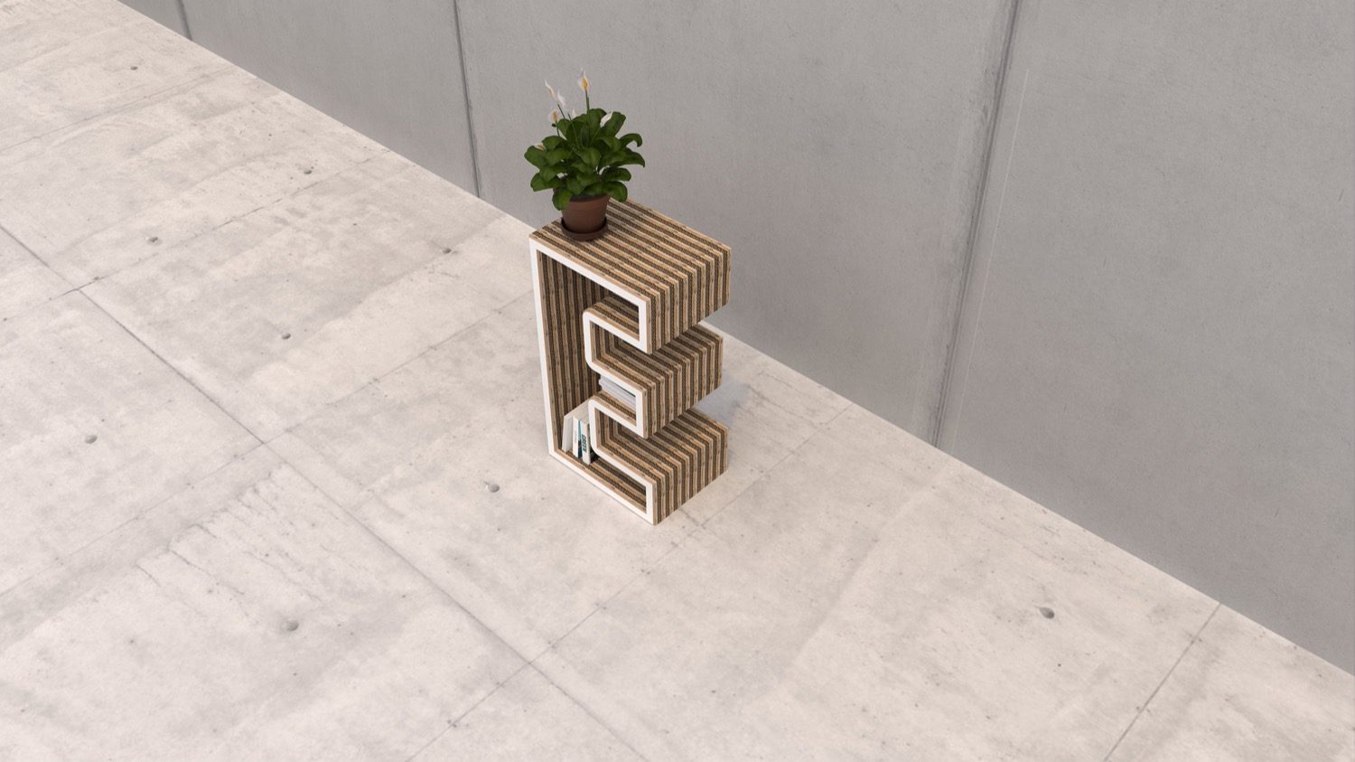 Lettera E sagomata: costruita a strati di cartone ondulato con frontale rivestito in MDF bianco, base e giunti in multistrato di pioppo.